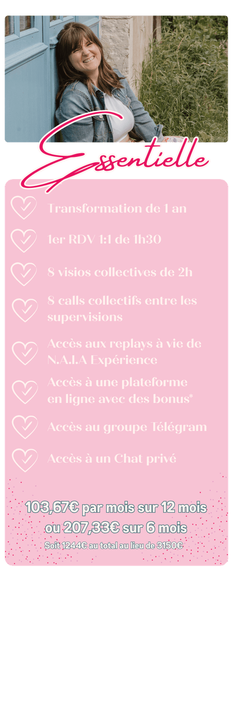 Oui, bien sûr. Pour rendre l’accompagnement accessible et léger à vivre, je propose une offre de lancement avec la possibilité de payer en 10 fois sans frais. Tu peux ainsi avancer dans N.A.I.A sans pression financière, à ton rythme, en te sentant soutenue dès le début.