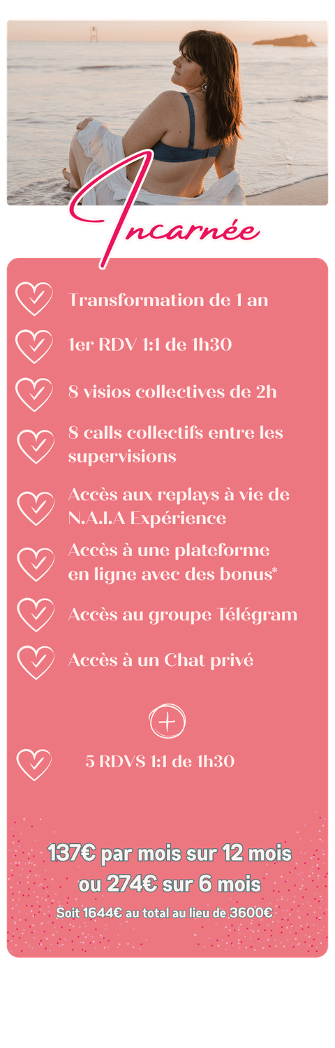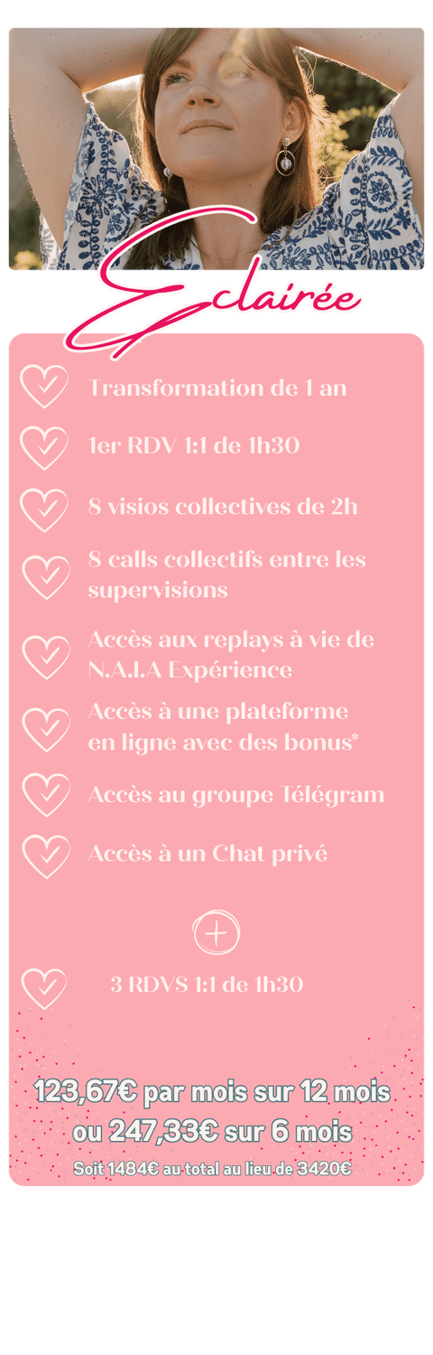 Et tu restes toujours libre, à chaque étape, d’ajouter des séances individuelles si tu en ressens le besoin. C’est pourquoi j’ai créé la formule “Éclairée” et “Incarnée”.